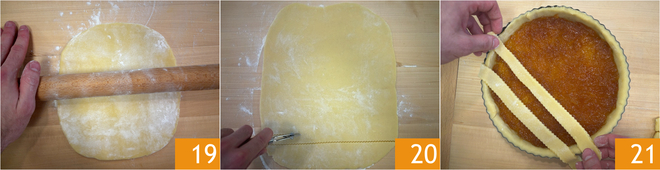 At this point, knead the pastry scraps and roll them out again to a thickness of 0.4 inches 19, then use a fluted pastry wheel to cut 8 strips about 11 inches long (0.8 inches more than the mold's diameter) 20. Lay 4 strips diagonally on the tart's surface 21.