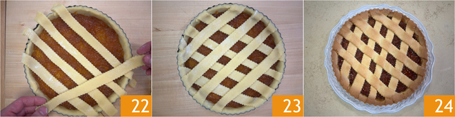 Do the same in the other direction with the remaining 4 strips 22, then remove the excess pastry, gently pressing the strips down 23. Bake in a static oven preheated to 340°F for about 50 minutes, placing the pan on the bottom rack. Once baked, take it out of the oven and let it cool to room temperature before removing it from the mold and serving your jam tart 34!