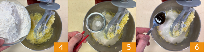When they are well absorbed, add the flour, preferably sifted 4, and the sifted yeast 5. For flavoring, also add the vanilla extract 6.