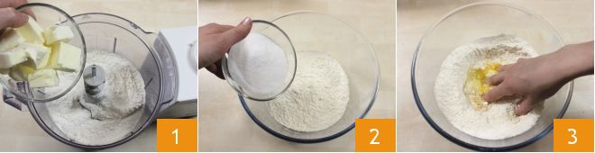 To make the jam tarts, start by preparing the shortcrust pastry following the procedure found in the Shortcrust Pastry card: place the flour, a pinch of salt, and the cold butter in the mixer 1. Blend everything until you have a sandy and floury mixture, transfer it to a bowl and add the sugar 2. Then, form the classic well with the mixture, into which you'll pour the seeds of the vanilla bean (split the bean and extract the seeds with a knife) and the egg yolks 3.