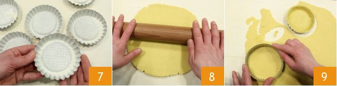 and flour 7 single-serving tart molds with a base diameter of 4 inches and 0.8 inches high. After the necessary time has passed, remove the shortcrust pastry from the refrigerator and roll it out with a rolling pin on a lightly floured work surface 8, creating a sheet about 1/5 inch thick. Then, using a pastry cutter with a diameter of about 5.5 inches, cut out circles of dough 9.