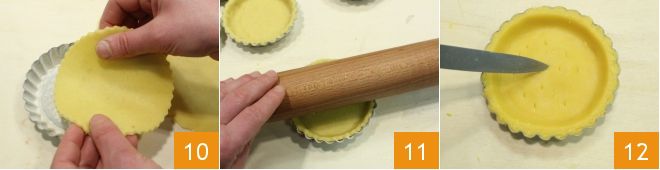 to line the molds 10, press gently with your fingers on the bottom and sides to make the dough adhere well. Run the rolling pin along the edge to remove excess dough 11. Prick the base of the tarts with the tip of a knife 12 or the tines of a fork to prevent the dough from rising too much during baking.