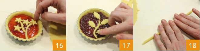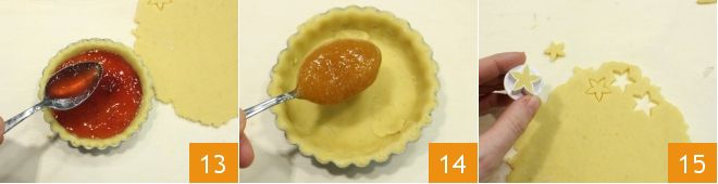 Now fill the tarts with strawberry jam 13, apricot jam 14, and cranberry jam (alternatively, you can also use citrus jams or other jams of your choice). At this point, you can focus on the most fun part of the preparation: decorating the pastry! Get small cutters with various shapes and cut out little shapes 14 to apply to the tarts to create a decorative pattern,