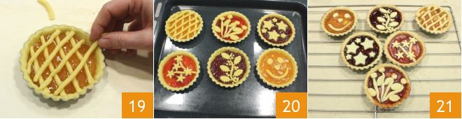 to place on the surface of the tart, creating the typical lattice pattern 19. Transfer the molds to a baking sheet and bake the tarts in a preheated static oven at 356°F for 25 minutes (or in a convection oven at 320°F for about 20 minutes). Once done, take your jam tarts out of the oven, let them cool slightly, then turn them out and serve them on a tray.