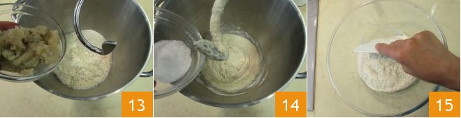 Finally, add the Jerusalem artichoke puree 13 and turn on the machine to mix the ingredients. At this point, also add the salt 14 and continue kneading for 5 minutes. Transfer the dough to a bowl and using a dough scraper, make 4 folds 15.