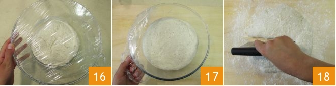 Cover with plastic wrap 16 and repeat the same operation after 10 minutes. Proceed this way for a total of 3 times. Then cover with plastic wrap and let it rise at about 80-82°F for 2 hours, the oven turned off with the light on will be fine. After this time, take the risen dough 17, transfer it to a floured pastry board and divide it into two equal parts with a dough scraper 18.