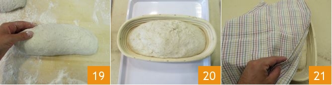 Flour two wooden molds and shape the two doughs to fit the molds 19. Place them inside 20, cover with a cloth 21 and let rise for 90 minutes, protected from air in a warm environment.