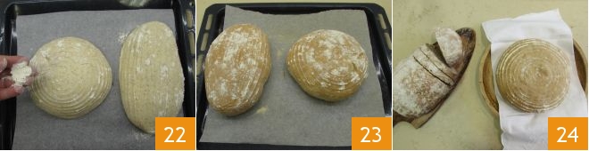 Line a baking tray with parchment paper and flip the loaves onto it, sprinkle the surface with a little flour 22 and bake in a preheated static oven at 392°F on the lower rack for 45 minutes. Once baked, remove from the oven 23 and let the bread cool before serving 34.