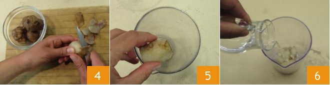 At the end of cooking, peel the Jerusalem artichokes 4 and place them in the tall glass of a blender 5: you will need about 3-3.5 oz of Jerusalem artichoke pulp. Pour in 3.5 oz of water 6
