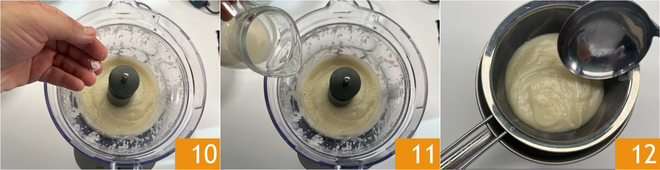 Now transfer the Jerusalem artichoke pulp to a blender and blend at high speed for 3 minutes. Season with salt 10, add the almond milk 11, and blend again for at least 5 minutes until you obtain a smooth cream. Strain the cream through a sieve 12.