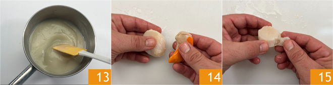 Collect the Jerusalem artichoke cream in a saucepan 13 so you can reheat it just before serving. Finally, prepare the scallops: remove the roe 14 and the tougher parts 15, then transfer them to paper towels to dry them.