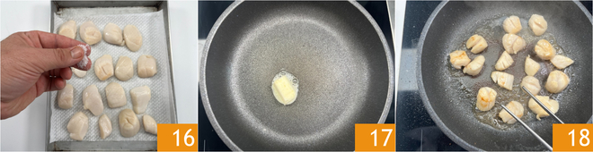 Salt the scallops on both sides 16. In a non-stick pan, melt the butter 17, then place the scallops and sear them for 2 minutes on each side 18.