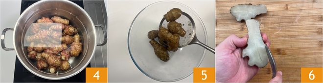 Move on to the Jerusalem artichokes: place the Jerusalem artichokes in a pot and cover with plenty of water 4, then cook for 3 hours, until the centers are soft. Turn off the heat and let them cool in their water, then drain the tubers 5 and cut them in half 6.