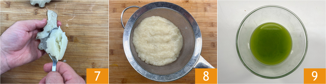 Scoop out the pulp with a spoon 7 and place it in a sieve to remove excess water 8. Meanwhile, take the green oil out of the refrigerator and bring it to room temperature 9.