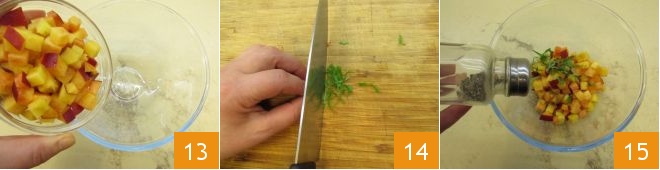 Wash the nectarine, cut it in half using a knife 10, remove the pit, and first slice it into 0.4-inch thick slices 11 and then into cubes 12.