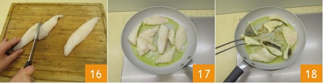 Now move on to the John Dory fillets; it's best not to remove the skin so they don't fall apart during cooking. Cut the fillets in half 16 to obtain 8 smaller pieces. Heat a drizzle of oil in a pan and place the John Dory fillets skin-side down 17, salt to taste, and cook for 2-3 minutes in total over high heat, flipping the fillets halfway through 18. Then turn off the heat.