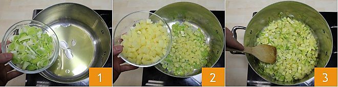 To prepare the kale soup, clean the leeks, slice them, and sauté them with extra virgin olive oil in a large pan for about 5 minutes 1. Add the potatoes, previously diced 2, and cook everything for about 10 minutes on low heat, stirring to prevent the potatoes from sticking to the bottom 3. Salt and pepper to taste.