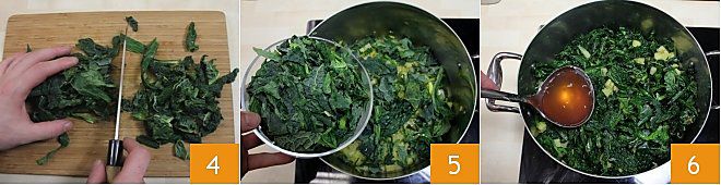 Clean the kale and roughly chop the leaves 4; you should get about 500 g (1.1 lbs) of cleaned kale. Add it to the pan with the other vegetables 5 and start adding the vegetable broth, one ladle at a time, keeping it always below the level of the kale 6 and let everything cook for 25 minutes.