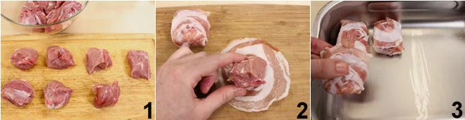 To prepare kid goat in the Marche style, start by removing the fat from the meat and cutting it into about 12 pieces of roughly equal size 1; season them with salt and pepper, wrap them in slices of bacon 2, and arrange them in an oiled baking dish (or oven pan) close to one another 3.