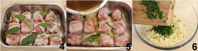 Sprinkle sage, bay leaves, and rosemary over them 4. Place the prepared dish in the oven and let it cook for about 30/40 minutes at 350°F (static oven), occasionally basting with white wine and a little hot broth 5. Meanwhile, prepare in a bowl the crumbled bread mixed with chopped parsley and crushed garlic 6.