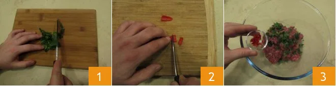 To prepare the kofta (Middle Eastern meatballs), finely chop the mint leaves 1, then cut the chili pepper in half lengthwise, remove the seeds with the tip of a knife, and mince it 2. Place the lamb meat in a bowl along with the chopped mint and chili pepper 3.