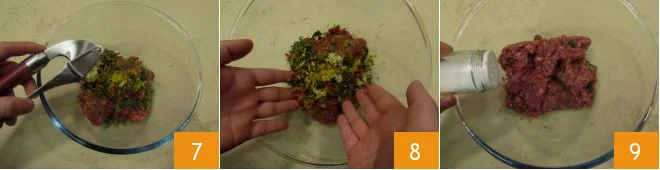 crush the garlic 7 and mix vigorously with your hands to combine all the ingredients well 8. Season with salt and pepper 9,