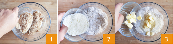 To make the lady's kisses with mortadella, first prepare the dough: pour the all-purpose flour into a bowl along with the almond flour 1 and mix, then add the grated Grana Padano DOP cheese 2 and the cold butter in cubes 3.