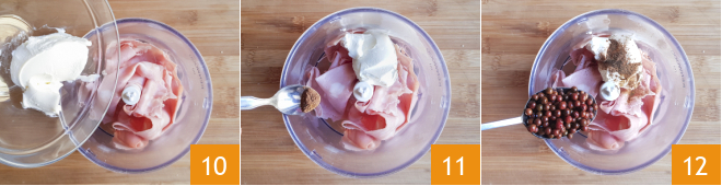 In the meantime, you can prepare the filling cream: put the mortadella into the mixer cup along with the creamy cheese 10, the nutmeg 11, and the pink pepper 12.