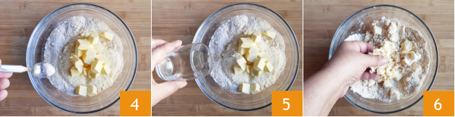 Add the salt 4 and the white wine 5 and work with your fingertips to incorporate the butter into the mixture 6.