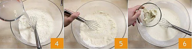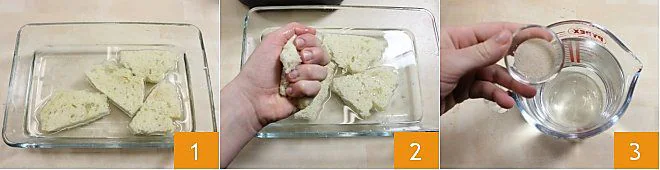 In a large bowl, mix the flour, sugar, and salt and gradually pour the water with the yeast over them 4, stirring with a whisk to combine the ingredients well 5. Add the soaked and well-squeezed bread 6 and