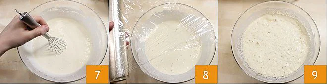 mix to break down the bread and eliminate any lumps 7. Cover the bowl with plastic wrap 8 and let the mixture rise at room temperature for about 2 hours; after this time, the mixture will be puffier and full of bubbles 9.