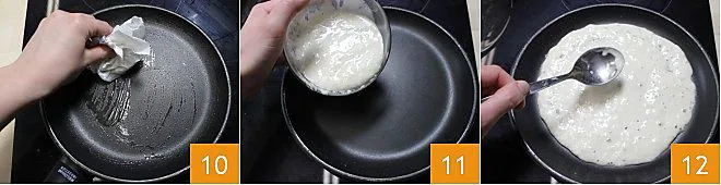 At this point, you can proceed to cook the lahuh: lightly grease (with vegetable oil or olive oil) a non-stick pan with low edges, about 8 inches in diameter (a crepe pan), spreading the oil with a piece of kitchen paper 10 and pour about 110 g of batter 11, spreading it over the entire surface of the pan, using the back of a spoon 12.