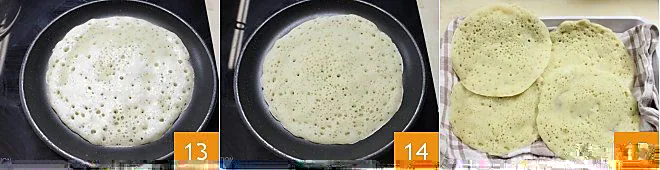 Cook the lahuh over medium heat, without ever turning the bread, until even the surface is set (13-14). Once cooked, place the lahuh on a clean cloth, cover it with another cloth. Before continuing with another portion of batter, it's important to cool the pan in a bowl of ice water or under cold running water, to get a smooth bread on one side and full of bubbles on the other. Continue cooking the remaining batter until finished 15. Serve the lahuh warm!