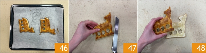 Bake the puff pastry lambs in the preheated fan oven at 350°F for 20 minutes. Once baked, remove from the oven and let cool completely 46. Cut the lambs in half horizontally 47, so they can be filled 48.