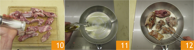 Salt the lamb 10, pour a drizzle of oil in a pan 11, place the lamb and brown it well on all sides over high heat 12.