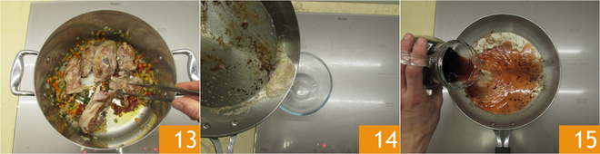 When it has a nice toasted color, transfer the pieces of lamb to the pot with the vegetables 13. Remove the fat from the pan where you browned the meat 14 and pour the red wine into the same pan 15, making sure to deglaze the pan well.