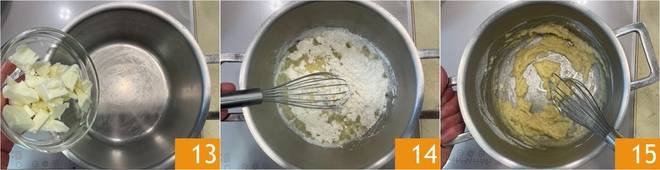 Now prepare the béchamel sauce: heat the milk, and in the meantime, melt the butter in a saucepan 13. Once melted, add the flour all at once and stir quickly with a whisk 14 until you get a golden mixture, the roux 15.