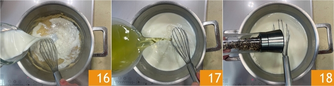 Slowly add the hot milk, while continuing to stir 16, then also pour in the asparagus broth 17, season with salt and pepper 18.