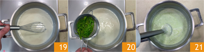 Continue stirring over low heat, until you reach the desired consistency 19. When the béchamel has thickened, add the asparagus broth scraps 20 and blend with an immersion mixer to obtain a smooth cream 21.
