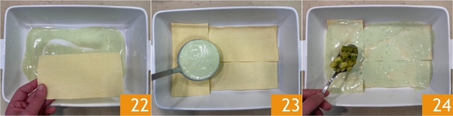 You are ready to assemble the lasagna: spread a layer of béchamel on the bottom of a 8x12 inch baking dish, then lay down the pasta sheets 22 and cover with more béchamel 23. Distribute some of the sautéed asparagus 34.