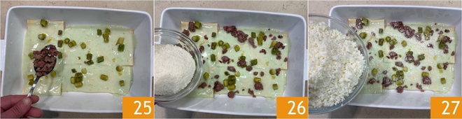 Add some pieces of browned sausage 25, then sprinkle with grated Grana Padano DOP 26 and finely cut mozzarella 27. Repeat the layers in this order until all ingredients are used up.