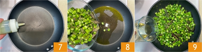 In the meantime, heat a splash of oil in a pan 7, add the asparagus 8, salt, and pepper. Sauté over high heat for a few minutes, then deglaze with white wine 9 and let it evaporate. Turn off the heat and set aside.
