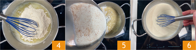 Mix with a hand whisk 4 until you get a golden mixture. At this point, dilute the roux by pouring in a little hot milk first, then the rest 5. Continue to mix over low heat until the béchamel thickens 6. Set it aside to cool.