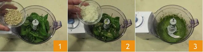 To prepare the lasagna with pesto cream, ricotta, and spinach, start with the Genoese pesto (Pesto alla genovese). After selecting the best basil leaves and washing and drying them very gently, place them in a blender with the pine nuts 1, then add the oil and the Parmesan cheese 2, and finally blend until you obtain the pesto cream 3.