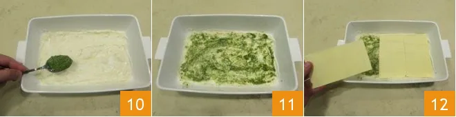 Add a spoonful of pesto 10 and spread it over the entire surface as you did with the béchamel sauce 11, and finally place a first layer of pasta 12 to completely cover the base of the dish.