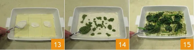 On the pasta, add a bit of béchamel sauce 13 and after spreading it well over the sheet, add some more pesto 14, and in this case too, spread it evenly, just as you did before. Once you have obtained an even layer, add the slightly pre-cooked spinach 15.