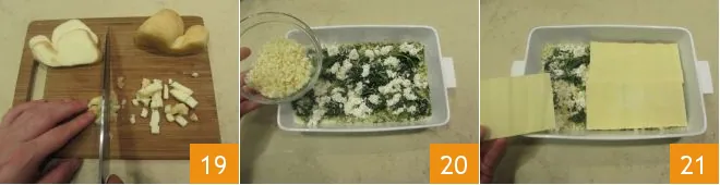 Chop the smoked provola cheese 19 and sprinkle it over the lasagna 20, and start the process again, beginning with the pasta sheet 21