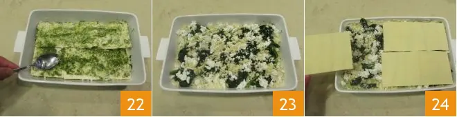 and add more béchamel sauce and pesto 22, then spinach, ricotta, grated Parmesan cheese, salt, pepper, and the chopped smoked provola cheese 23. Continue in this way until you have 4 layers of lasagna, forming the various layers of pasta by changing the direction in which you place the sheet - first vertically, then horizontally, and so on 34.