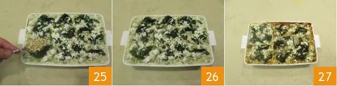 On the last layer, finally add the pine nuts 25, and then cook in a preheated static oven at 356°F for 20 minutes (or in a fan oven at 320°F for 10 minutes) 26. If you want a bit of crispiness on the surface, let it cook for another 5 minutes in grill mode to get the lasagna with pesto cream, ricotta, and spinach with an irresistible crispiness!