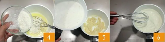 Then move on to preparing the Béchamel sauce. Make a roux by pouring the flour into the melted butter 4, and after mixing well over medium heat until the base turns a hazelnut color, pour in the milk that has been set aside to warm and already seasoned with salt and grated nutmeg 5. Finally, continue cooking over low heat, stirring vigorously to prevent it from burning at the bottom, for another 5-6 minutes until the béchamel sauce thickens 6.